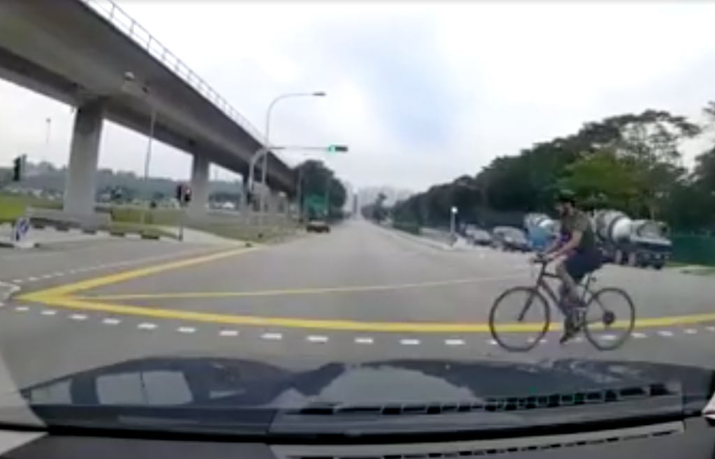 Dashcam footage uploaded on the Love Cycling SG Facebook group showed the moment a car unwittingly crashed into a man who’d been cycling across the road — when the traffic lights were green for the driver.