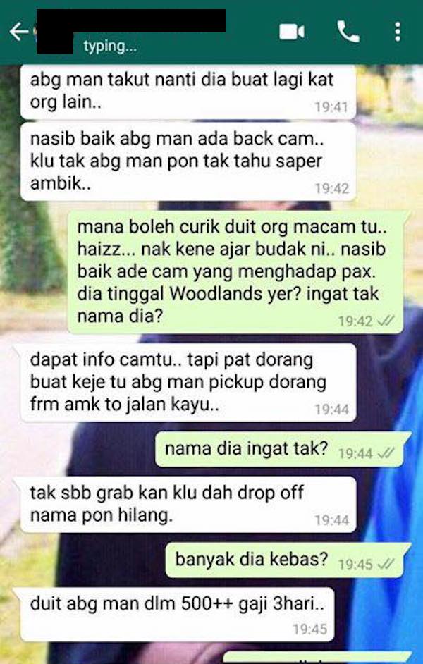 In a screenshot of a WhatsApp conversation, reportedly between the Grab driver and another person, the victim mentioned that he was not able to get the personal details of the passenger as his name disappeared after he was dropped off. What’s sad is the fact that the alleged thief apparently made away with three days’ worth of his earnings.