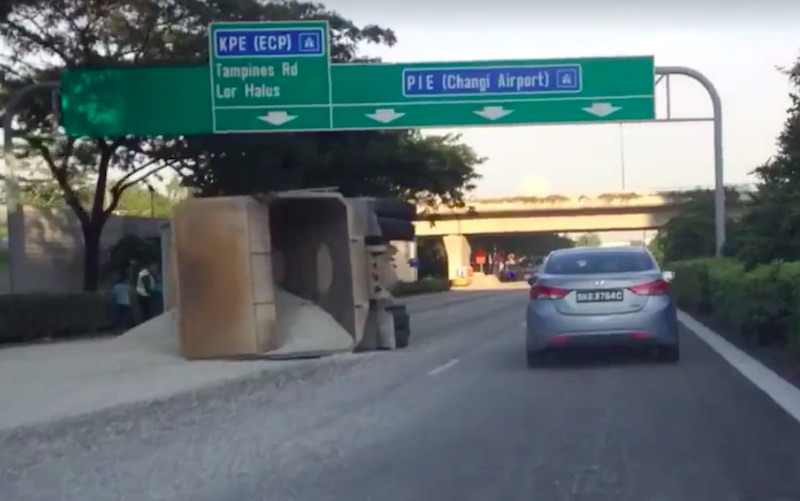 A tipped-over tipper truck had spilled gravel all over the TPE around 5.05pm that afternoon, blocking three whole lanes on the expressway. Watch how the monstrous vehicle fell over, as captured on dashcam by Koh Yew Hock and uploaded on the Beh Chia Lor Facebook page:
