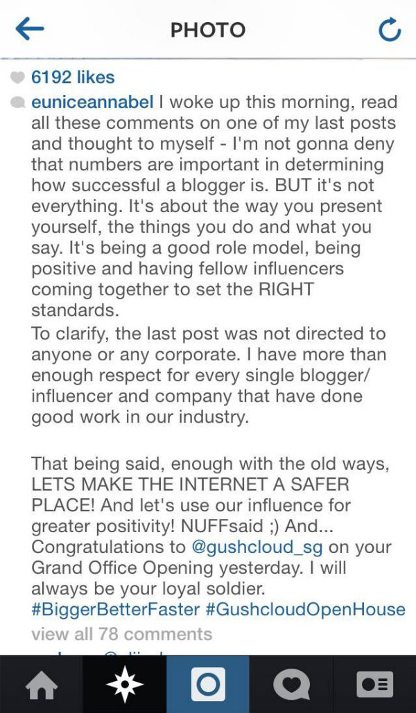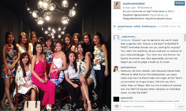 Eunice Annabel, a Singapore blogger under Gushcloud, drew attention after uploading a picture on herInstagram on July 25. Mustering a poised look, she sits posed in the centre of 12 other fellow bloggers and her caption boasts: “So you wanna be on top? Gotta beat us first.”