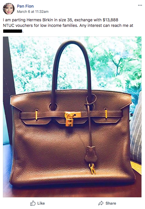 If you’re thinking about buying a bag for a good cause, here’s your chance. On Mar. 6, a lady by the name of Pan Fion put up a post on Facebook announcing her parting with her prized Hermès Birkin bag. But instead of cold hard cash, she wanted to exchange it for S$13,888 worth of NTUC vouchers… to give out to low income families.