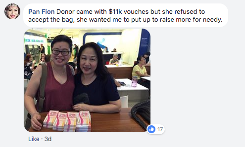 But even she must’ve been surprised when a donor came along in response to her post and offered her S$11,000 worth of vouchers, all the while refusing to take the bag so that more money could be raised for the disadvantaged.