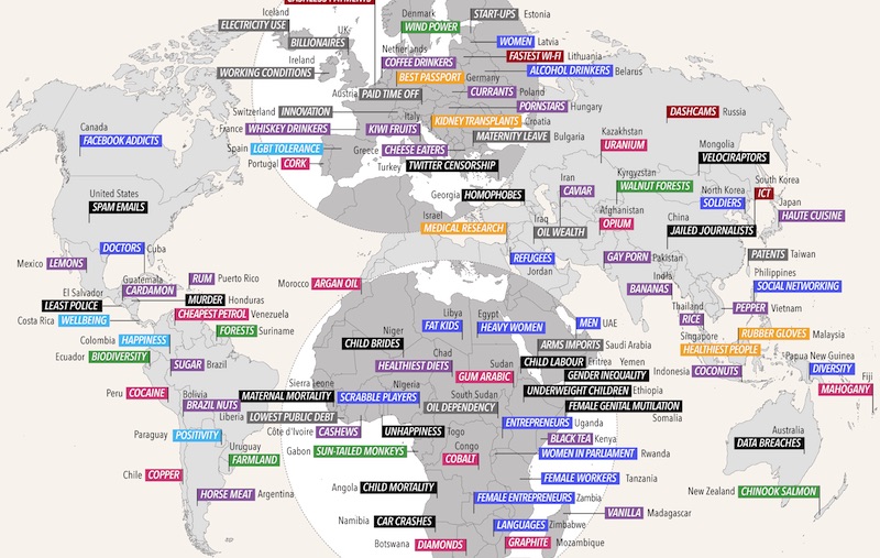 Nonetheless, Information is Beautiful did collate a rather interesting map of what each countries in the world are best at according to a number of databases that includes the CIA, World Bank, Reuters and Forbes.