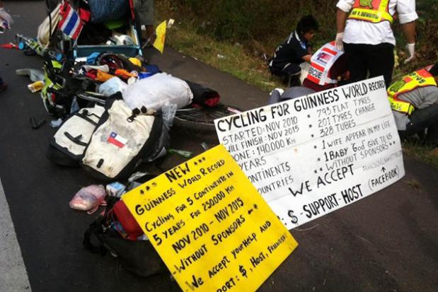 Villa had set out in 2010 to attempt a new Guinness World Record by cycling 250,000km around the world in five years, accompanied by his wife and son. They rode to Thailand on two bicycles, one fitted with a mini carriage that their son sat in, The New Paper reports. This November was supposed to be the end of the five-year-long record-setting expedition.