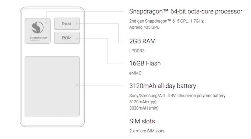 It also boasts a 2nd-gen Qualcomm Snapdragon 615 octa-core 64-bit processor, 2GB of LPDDR3 RAM and 16GB of onboard Flash, as well as two 4G SIM slots. It has a 13MP rear camera with HDR mode for high quality photos, and a 5MP front camera with an 80-degree wide angle lens and a Beautiful function.