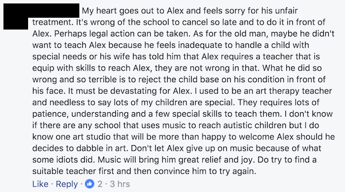 According to writer and musician Ivan Lim, his special-needs son — who is autistic — was rudely denied a lesson by an instructor at the school, who refused to teach the 12-year-old on grounds of his autism.