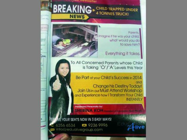 A full-page advertisement by tuition agency Education Alive depicting a child precariously trapped under a four-tonne truck has been ordered to cease.