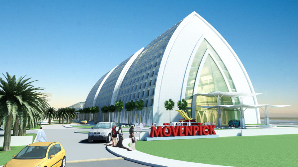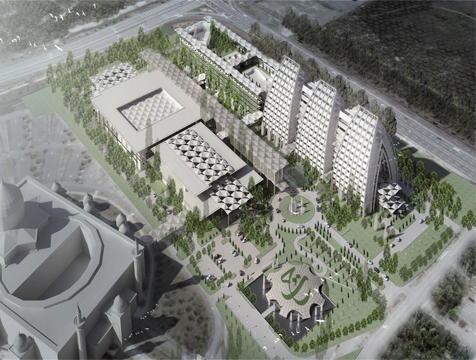 Though the entire property was built to suit Islamic law — including separate male and female swimming pools, gyms, and spas — our first thought when we looked at the renderings was “modern American megachurch.”
