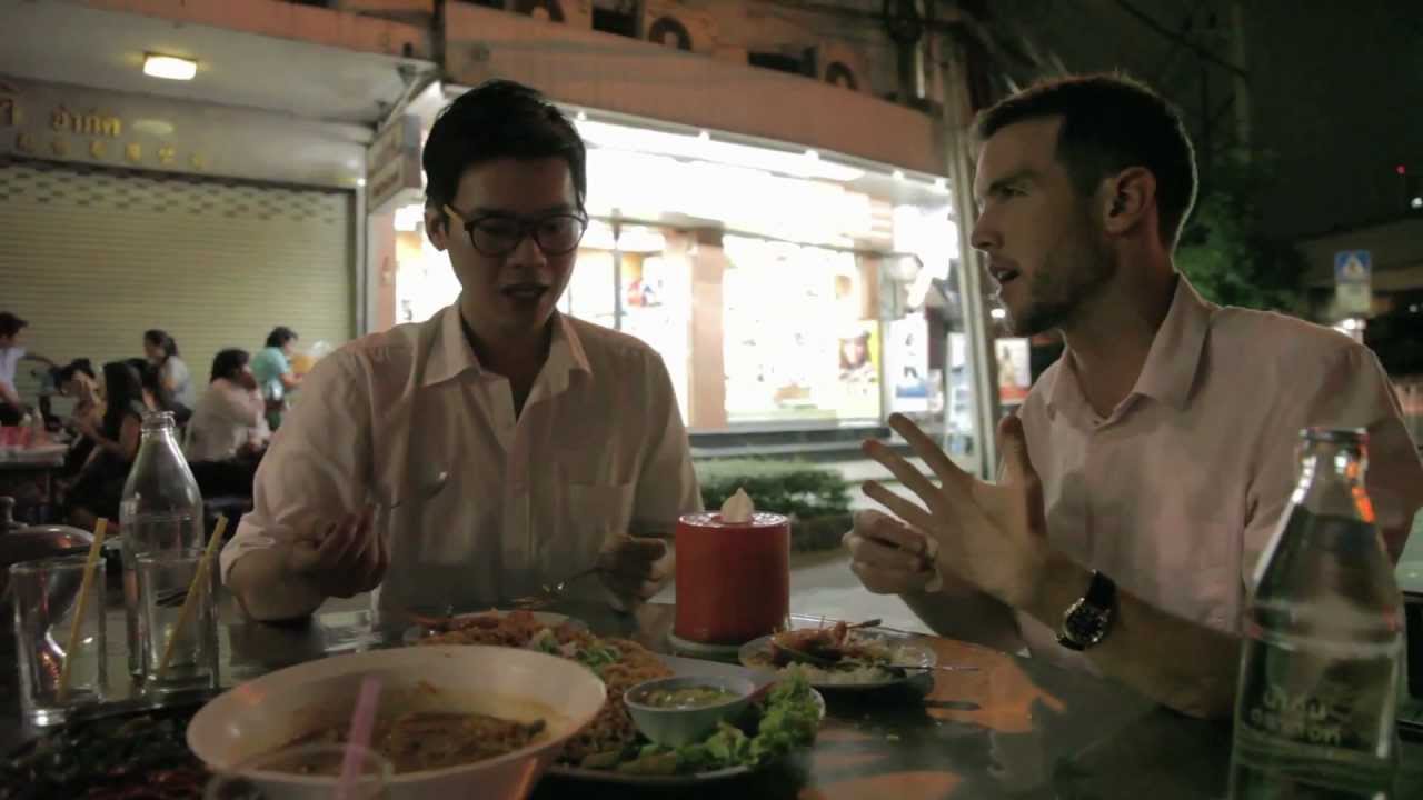 Coconuts Bangkok editors Shane Danaher and Praj Kiatpongsan sample traditional Thai dishes like Kaeng Som Cha-om Thot (sour and spicy soup with acacia omelette and prawns), Yam Pla Duck Foo (deep fried catfish with mango salad), and Pla Kaphong Tod Nampla (deep fried catfish with fish sauce).