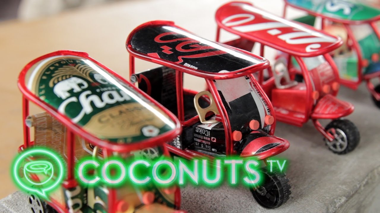 Mr. Noi’s workshop and home is on the sidewalk of a busy Bangkok street. As the member of a small homeless community, he earns his living by crafting and selling cool little aluminum tuk tuk toys made from discarded cans.
