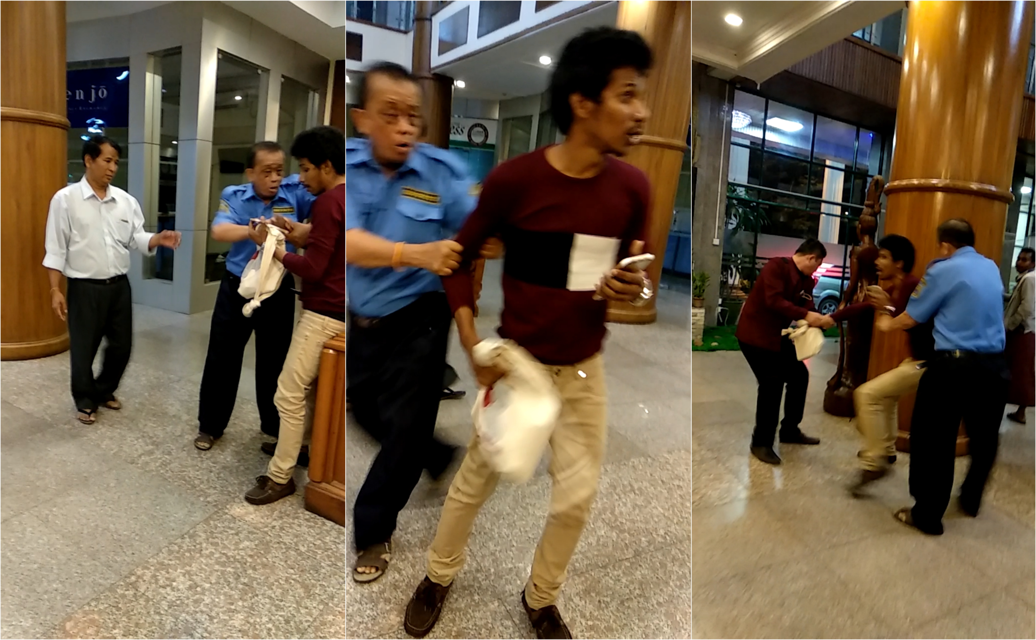 Than Toe Aung discreetly called his father, who listened as his son argued with the cops. During the dispute, one of the men handcuffed him, and he called out for help from the hotel staff, who were now silently watching the drama unfold from the lobby entrance.