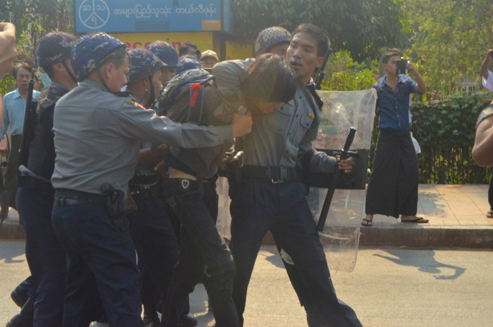On March 10, police detained a man in Yangon protesting against the government’s crackdown on student protestors in another part of the country on the same day. Photo / Phyo Thiha Cho / Myanmar Now
