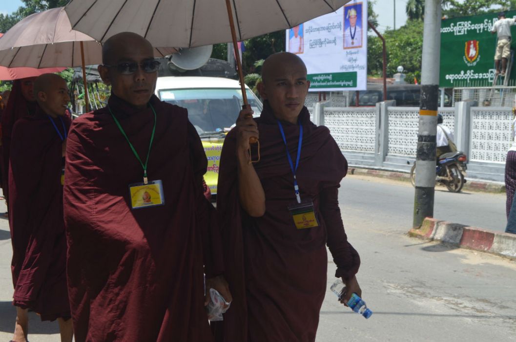 In last September, a group of Buddhist monks walked in front of the office of the Union Solidarity and Development Party in the town of Pathein in the Ayeyarwady Delta to join a rally which was held to celebrate the success of ‘race and religion’ laws. Photo / Swe Win / Myanmar Now