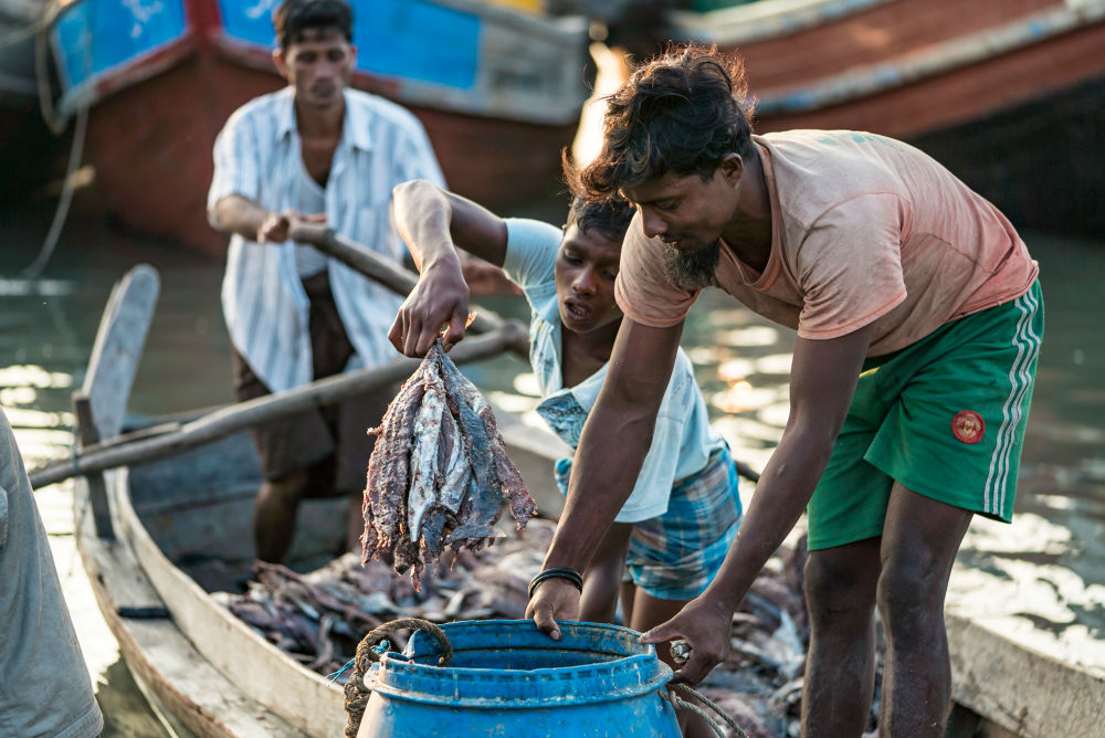 Rohingya fishermen offload salted fish to be sold in the IDP camps. For the Rohingya lucky enough to have a job, fishing is an important only source of income. Photo: Alexander Hotz / Coconuts Yangon