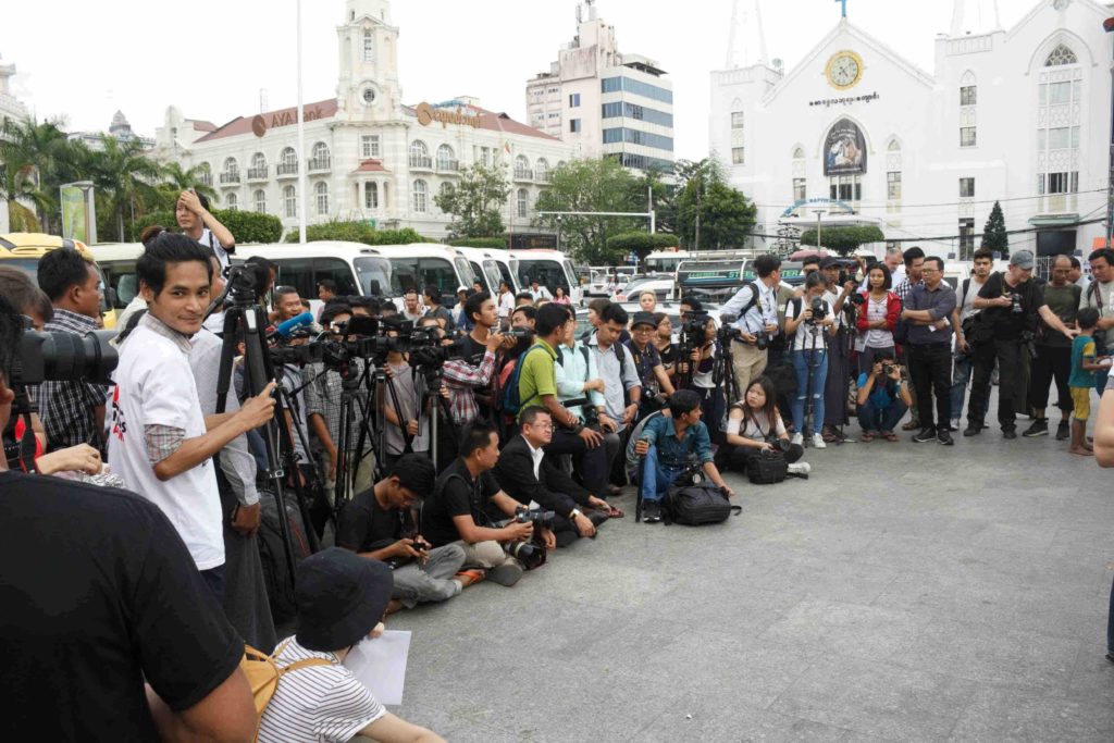 Protestors wearing shirts with the same slogan lined up in front of journalists and reporters and carried posters of the Time Magazine cover featuring Wa Lone’s and Kyaw Soe Oo’s wives Pan Ei Mon and Chit Su Win, photographed carrying portraits of the two journalists.