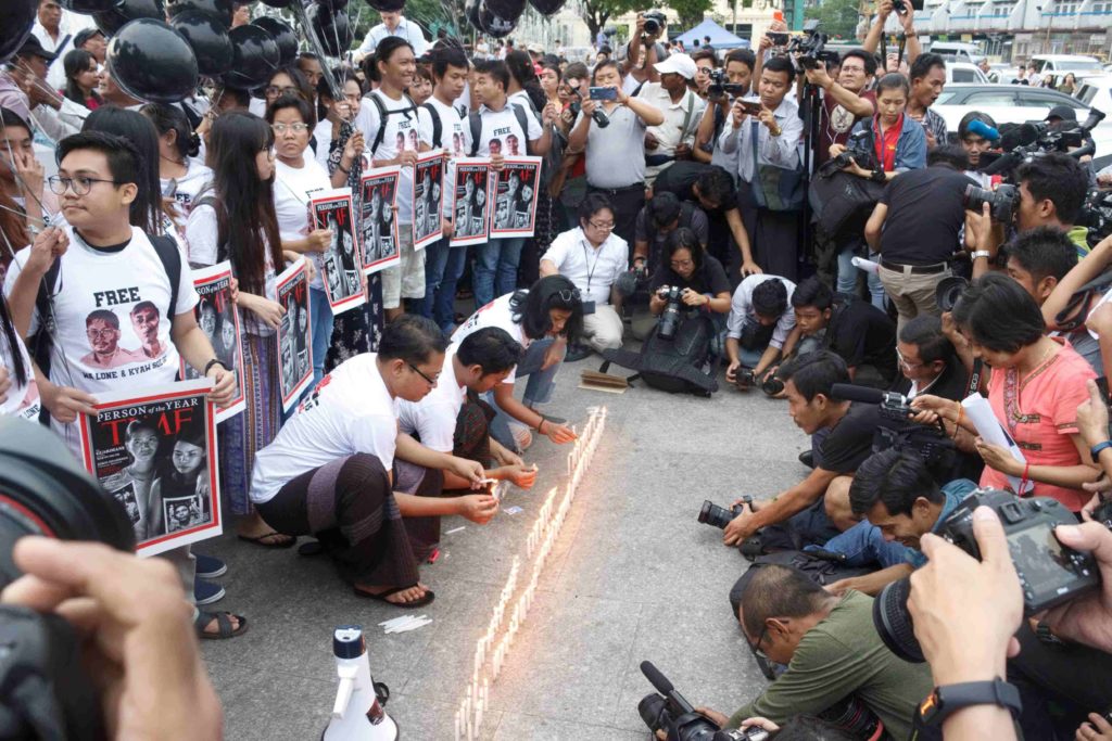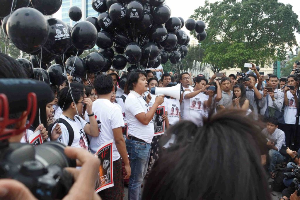 Journalists and rights groups rallied in downtown Yangon on Wednesday to mark one year since the detention of two Reuters journalists, who are serving seven-year sentences related to their reporting on a military massacre of Rohingya Muslims.