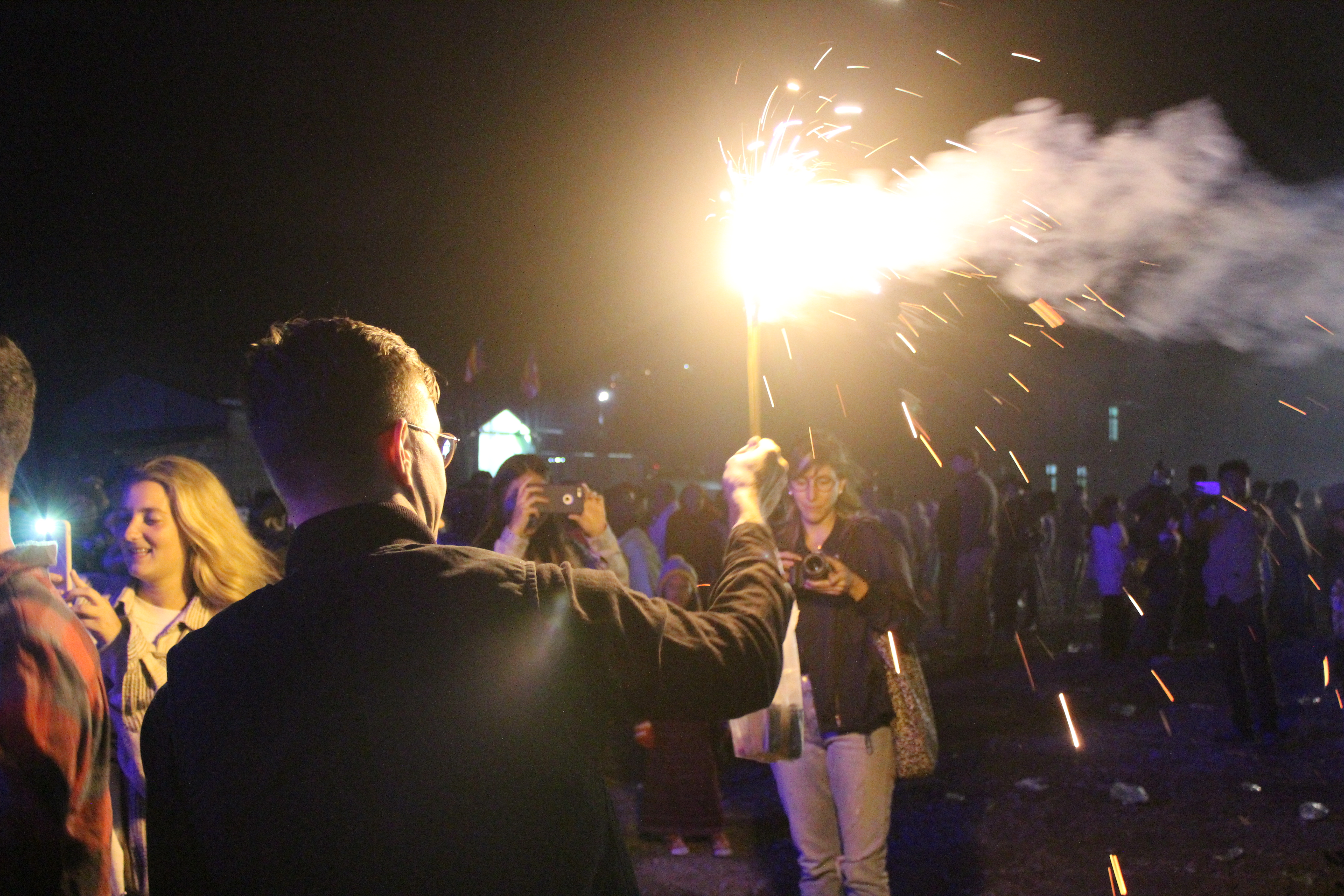 Some audience members stay back and watch the fountain of flames from afar.