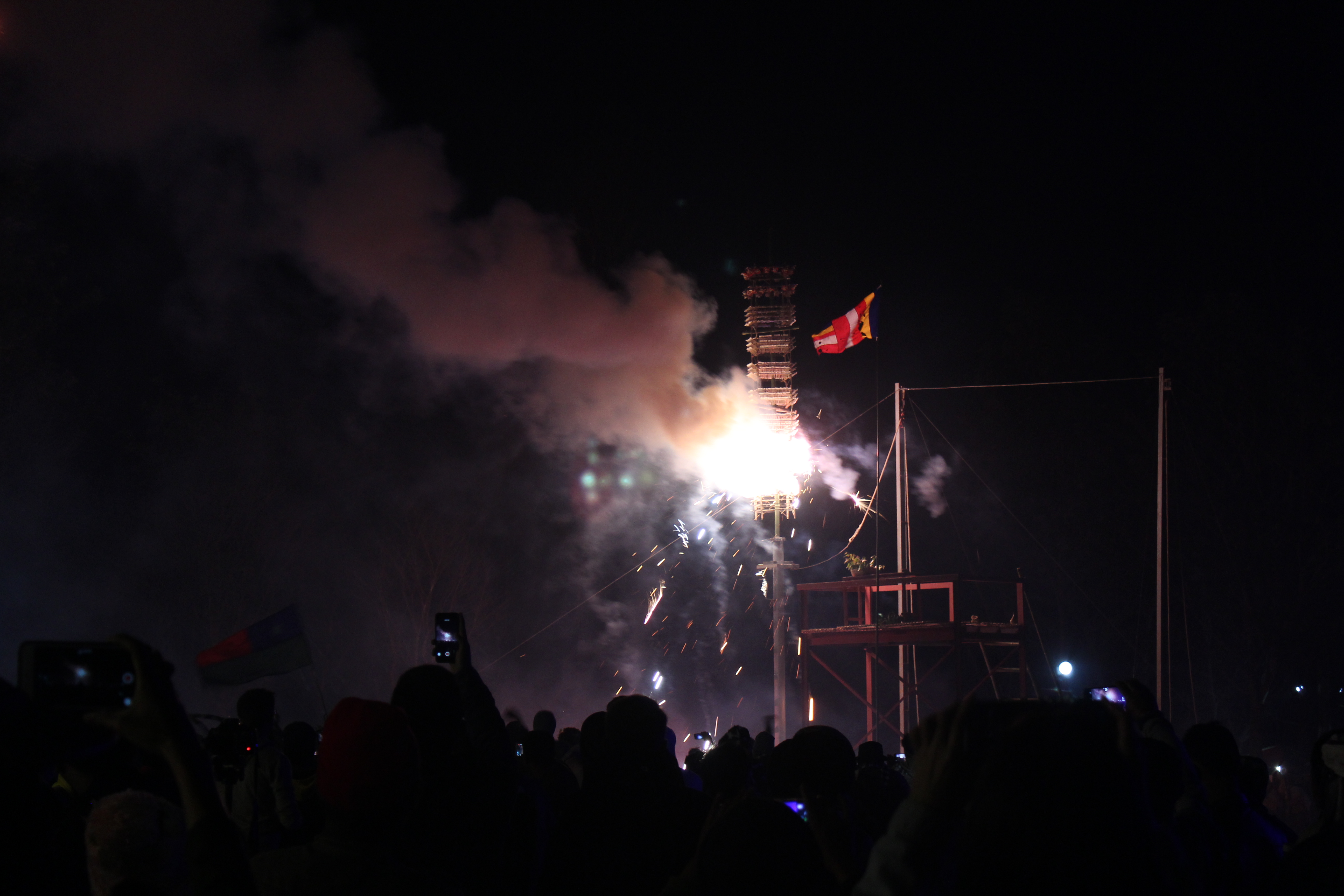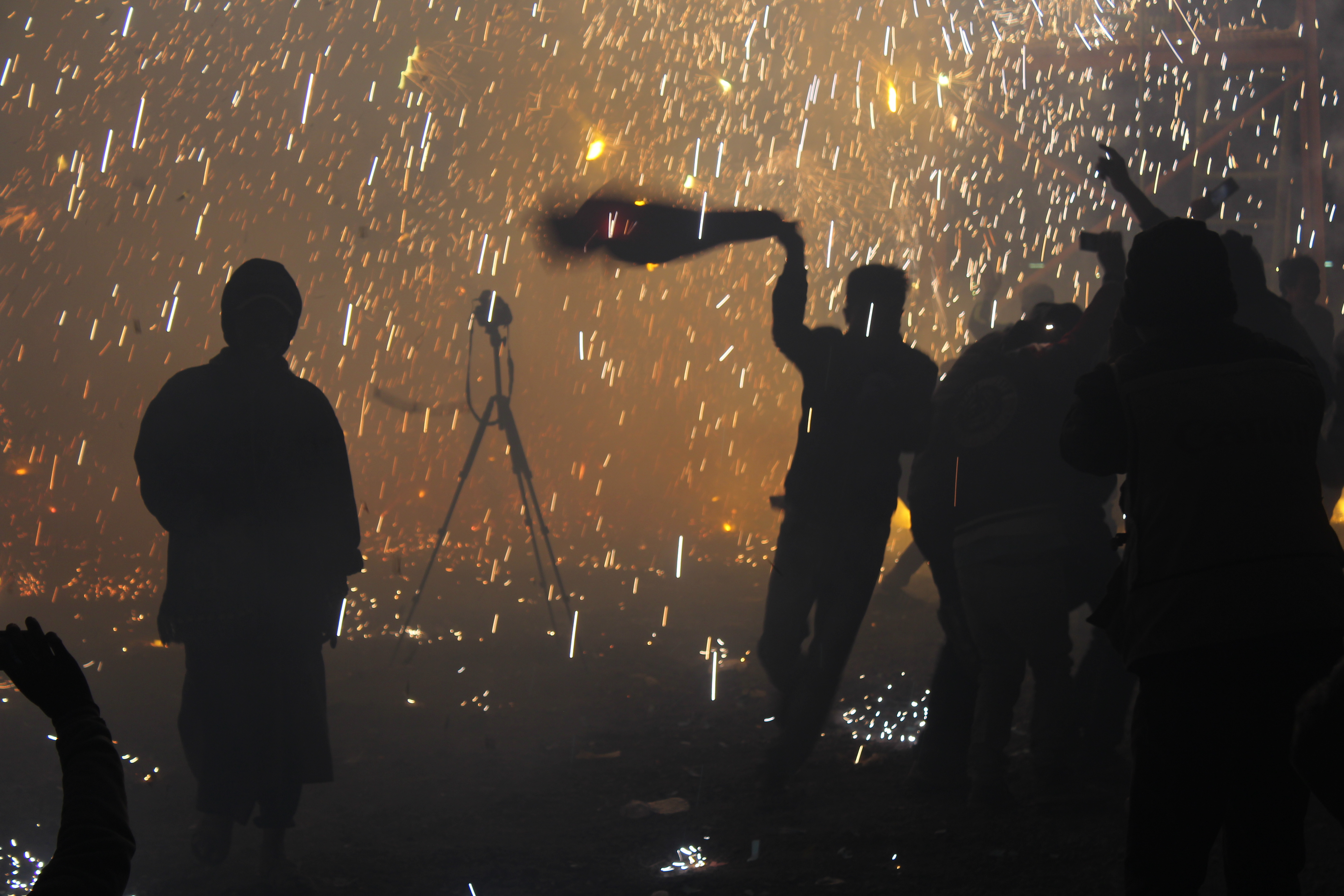 The poles are erected one by one in a corner of the field and then lit. Each one sprays the crowd of hundreds with fireworks for several minutes, triggering a frenzy of adrenaline-hungry activity.