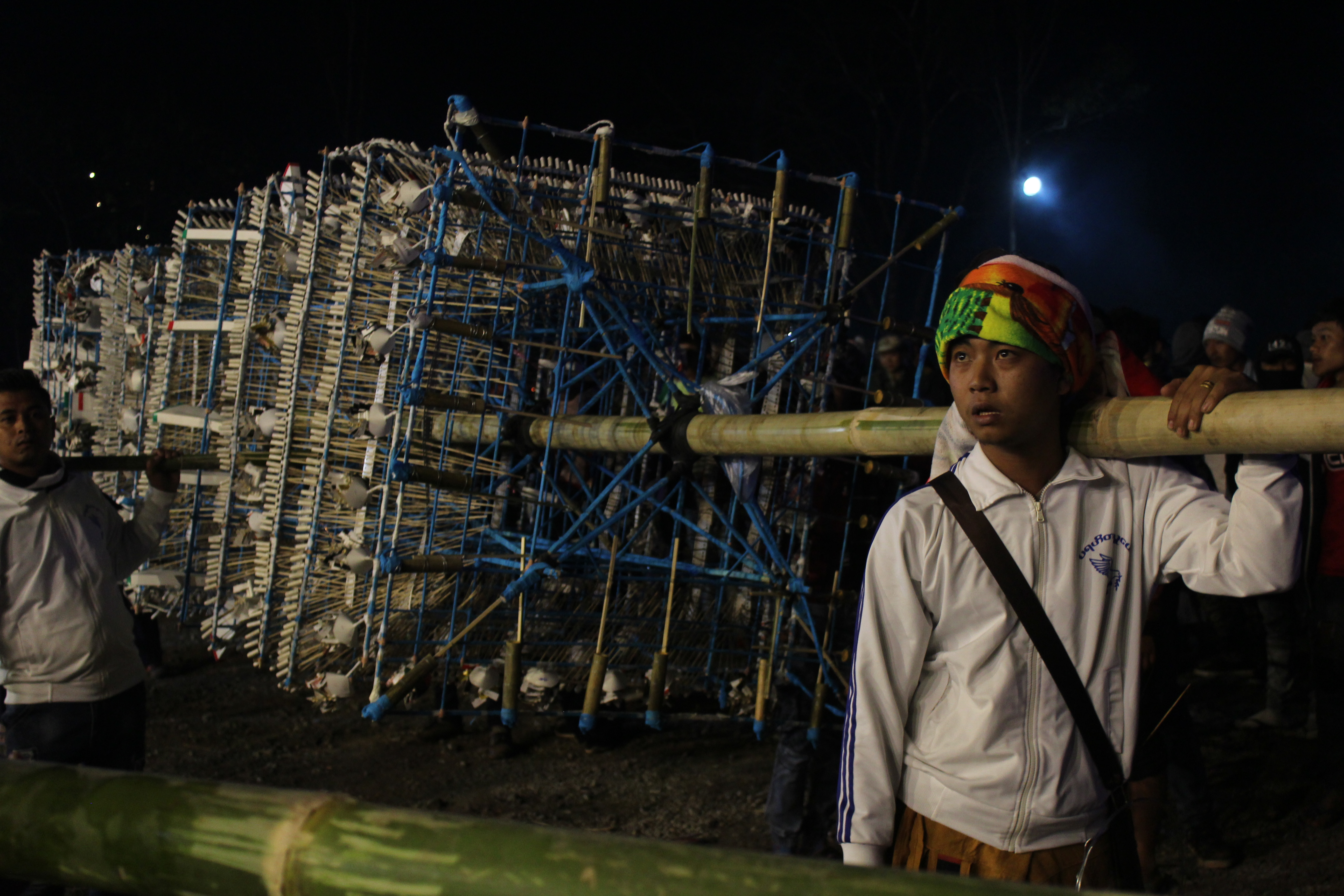 The main event in Kalaw during the Tazaungdaing festival starts when teams representing different local organizations haul out giant stacks of fireworks arranged carefully around the tops of bamboo poles.