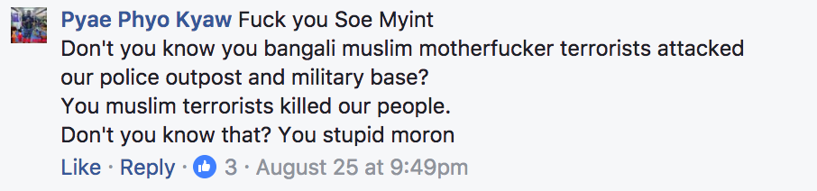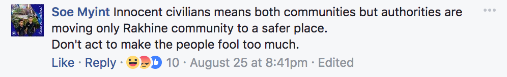 8:56pm: The Information Committee acknowledges the statements of the UN and the governments of the US, UK, Australia, and Turkey “condemning the coordinated attacks carried out by extremist Bengali terrorists in northern Rakine State.” (English)