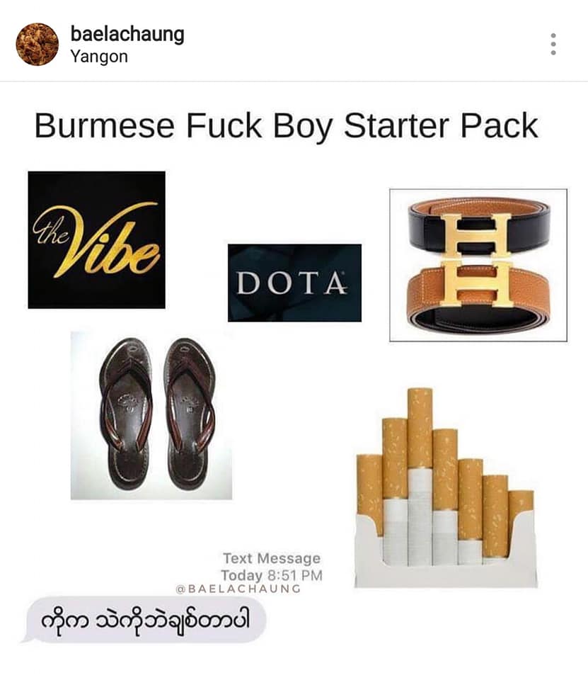 In a little over a month, a mysterious Instagram account called baelachaung has attracted over 1,000 followers to its seemingly endless stash of incisive memes about the paradoxes of Myanmar urban life. From smug expats to flashy fuckboys to parents who just don’t understand the generation they’ve produced, no one is spared from baelachaung’s wit.
