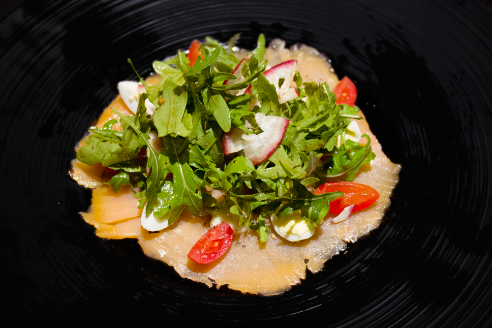 Sure, smoked salmon isn’t that romantic. But under the spotlights and a conversational hum and a happy hour wine, maybe it can be? This salad is sensational, though more like salmon tapas than a salad. It’s served with cherry tomatoes, boiled egg, and thin-sliced radish. There’s a light sauce similar to a hollandaise and balsamic vinegar to accent it. This is described on the menu as ‘old balsamic vinegar,’ which sounds funnier than saying ‘aged,’ I think.