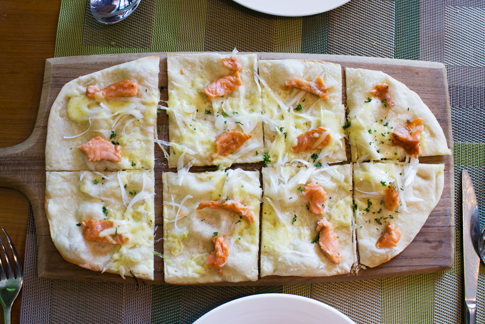 Mahlzeit is a German restaurant in Sanchaung, and in keeping with European tradition, it features lots of fish on the menu (Side note: This is also one of the most interesting menus in town). I tried this flatbread dish one Sunday, and I found that though it looked a bit suspect, it tasted marvelous. It was a more cooked version of smoked salmon, in contrast to the other dishes on this list, and came scattered on a lovely, light flatbread with more onion-like leeks and savory, melted cheese. The salmon is strong and fishy, but in an ideal way. The flatbread was baked perfectly.
