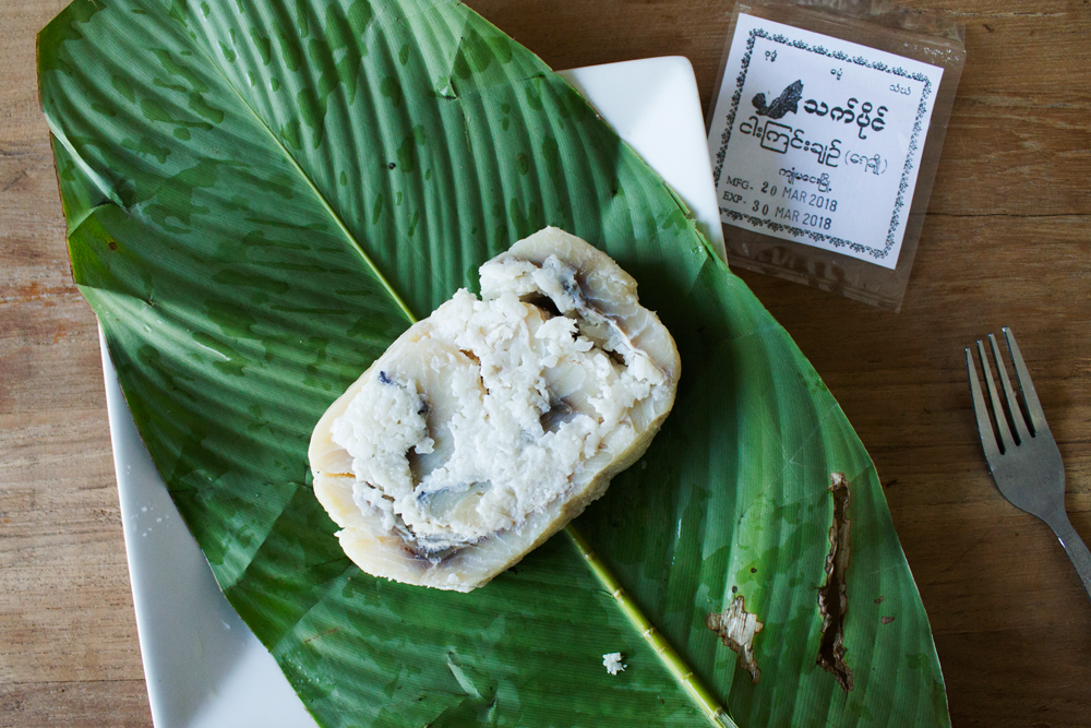 Myanmar has various local traditions of delicious cured fish, from fermented ngapi paste to dried fish that you often see crisping in the sun, laid out like long socks on boulders and sidewalks. But the closest thing to lox I’ve heard of is the pickled nga gyinn (Mrigal carp), which is a cooked and cured filet mixed with rice and wrapped up in a banana leaf. Sometimes, it’s tucked into a tight roll, or cubed like a salad. It packs a deliciously sharp and salty punch, but doesn’t quite have that soft, raw feeling that a smoked salmon filet has, nor the touch of sweetness from the brine. There are rumors of smoked and cured river fish in the north. I’m still learning and looking and tasting.