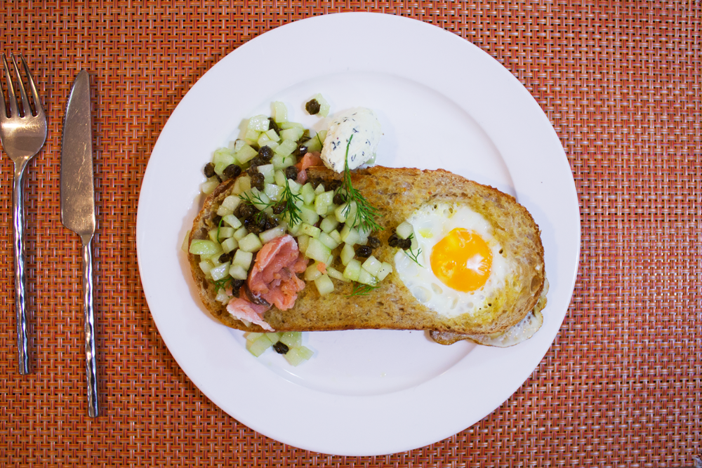 Pearl Condo will never be the most inviting place, but walking into Yangon Bakehouse is always a warm experience, especially knowing they have a solid breakfast. This dish includes rolled-up smoked salmon served under a pile of cucumber on a buttery multigrain egg-in-the-hole (or frog-in-a-hole, or egg-with-a-hat, yada yada). This means the egg is cooked into the bread. The salmon is drier than others; less smoky than just salty, and kind of formed into a roll. The bread is tough on the outside, yet warm and super buttery on the inside. The contrast of this with the cool cucumber is beautiful, especially when mixed in with the supreme unifier: a pat of dill cream cheese.