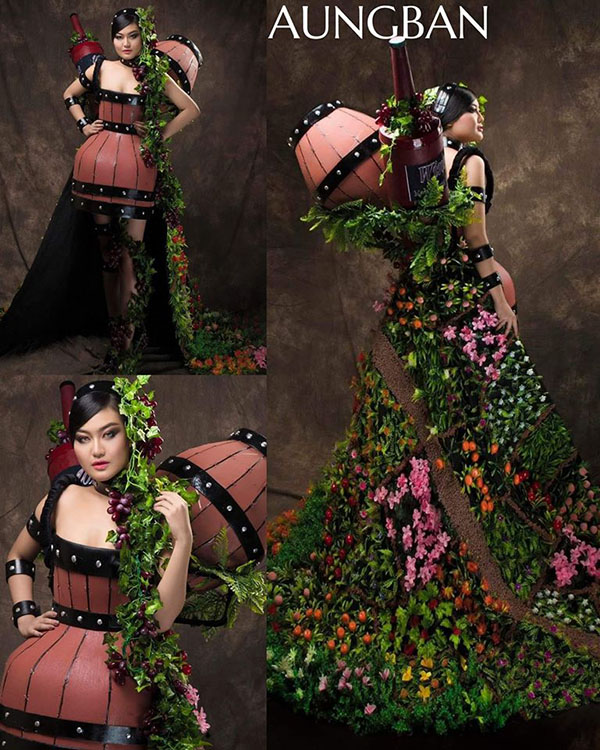The more than 30 costumes all bear remarkable names of locales such as Mandalay, Yangon (East, West, South & North!), Naypyidaw, Mogok, Monywa and Taunggyi. All were created by young Myanmar fashion designers and feature accessories unique to each place: Miss Aungban is a wine barrel, Miss Mogok a ruby.