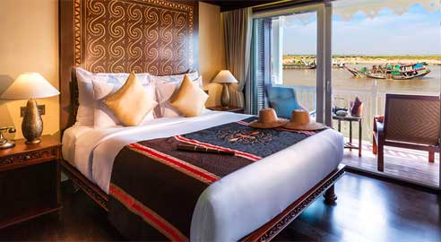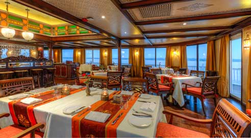 Meals can be taken in the staterooms or at the river boat’s restaurant, Hintha Hall, which is decorated in grand old Bagan style and features classic Burmese and Western dishes.