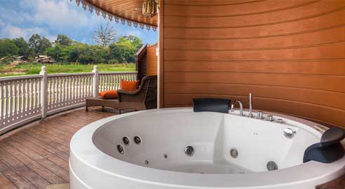 The color scheme juxtaposes rich woods with saffron, rich green, and pops of orange. If you’re looking to really splash out, splurge on one of the suites. The junior and executive suites feature baths overlooking the river, but it’s the two royal suites, with massive round jacuzzis on their own private terraces decked out with fine art, that really got us going.