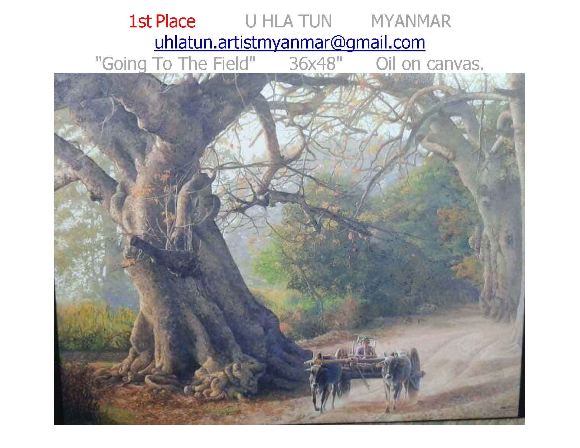 Mandalay-native Hla Tun, 65, won the top prize in the “Landscape with Life” category with his painting “Going to the Field.”