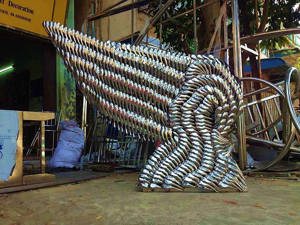 Aung Myat Htay, for instance, has curated a series of public art installations and interactive sculptures that will be on display at various locations across Yangon. Featuring staples of Myanmar culture such as the pattala (Myanmar xylophone), pathein umbrellas, and steel spoons — whereas foreigners have knives, forks, and spoons, Myanmar people use the one steel spoon for every meal, Aung Myat Htay explained — the installations express an underlying theme of sharing and working together as citizens.