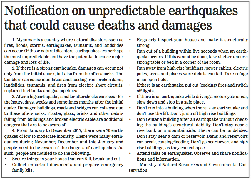 Myanmar was hit with an unusually large number of earthquakes in the first two weeks of 2018, according to the Department of Meteorology and Hydrology (DMH). However, experts say this is no indication that a big one will strike soon.