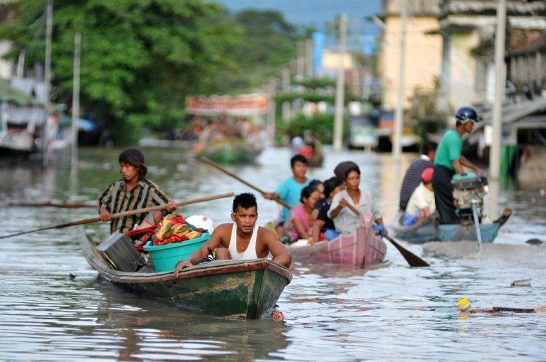 Residents of Kalay, Sagaing Region, paddle through the floodwaters. This area has been particularly badly affected by days of heavy rain. Photo/ Sai Zaw / AFP