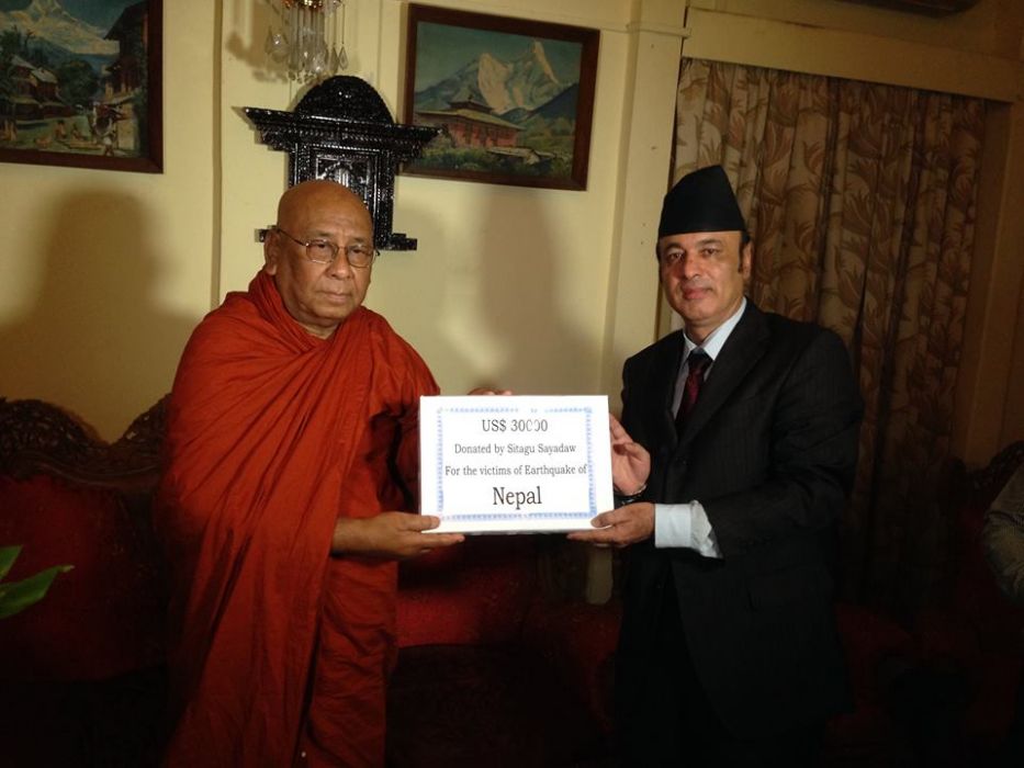 The handover took place at Nepal’s embassy in Yangon on Thursday. Sitagu said Nepalis should be helped as they are fellow Buddhists, and Nepal’s ambassador was thankful.
