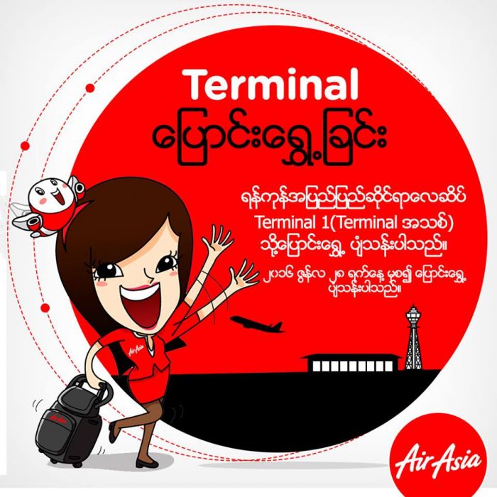 Important news for Air Asia customers in Yangon. From now on, you should check-in at the shiny new terminal.