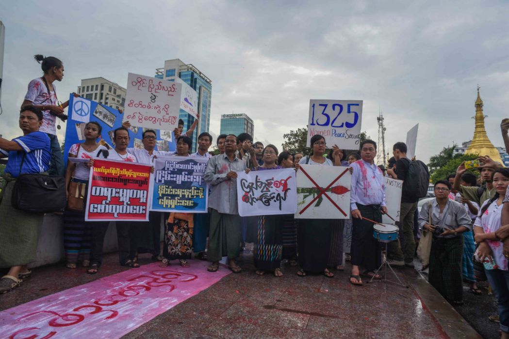 More than 100 activists and members of different civil society organizations protested in front of Yangon’s City Hall this weekend to demand an end to fighting in northern Myanmar