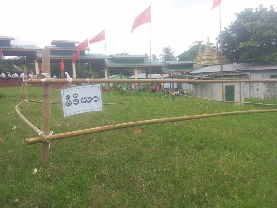 Party chairman Aung San Suu Kyi is scheduled to give a speech in about an hour at the location in Yangon region’s Thanlyin township. The field is part of a pagoda. NLD flags are set up in the background.