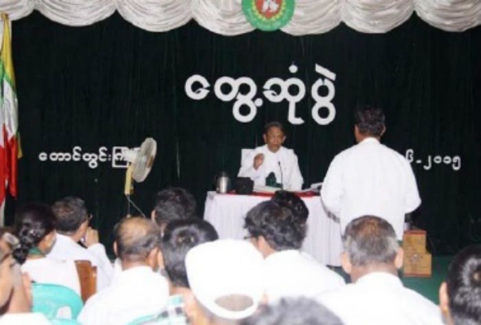 Photo / Aung Thaung giving a speech to party members on June 19, 2015 / USDP
