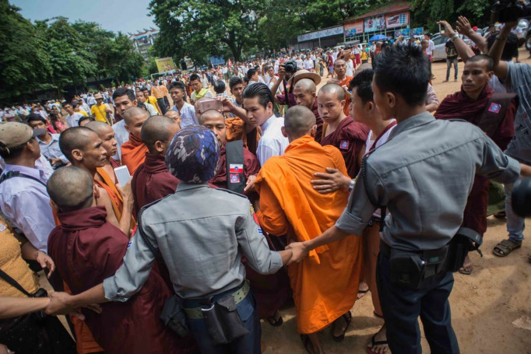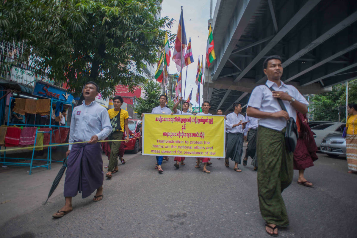 In his speech, U Thu Nanda, a nationalist monk from central Myanmar, summed up the protest by calling it: “Objections to the harms caused on national affairs and a mass demand for prevalence of law.”