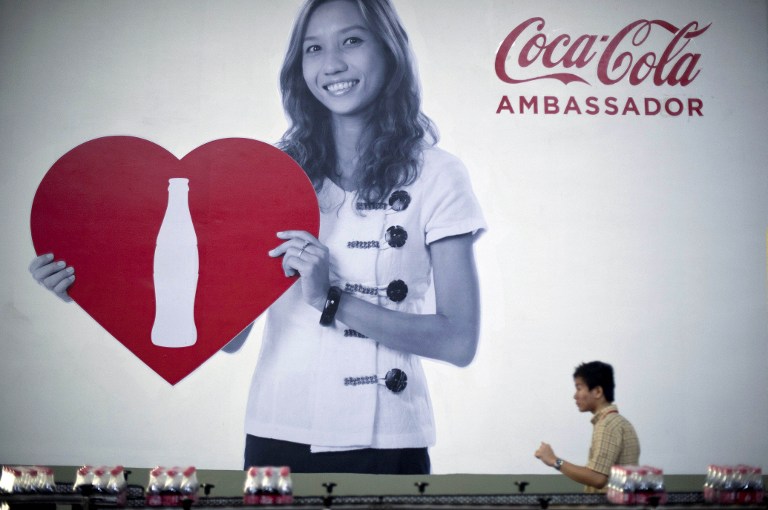 An employee walks past a billboard at a Coca-Cola bottling plant in Yangon on June 4, 2013. Coca-Cola on June 4 opened a factory in Myanmar as it returns to the former pariah state after an absence of more than six decades. AFP / Ye Aung Thu
