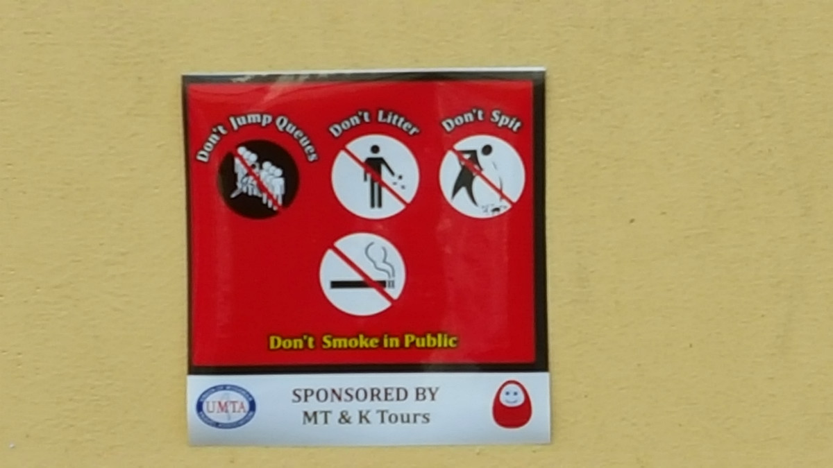 To that end, the Union of Myanmar Travel Association (UMTA), an industry group, has placed stickers on several buildings downtown that warn local residents not to do annoying things like litter, smoke in public, spit betel nut and cut in line.