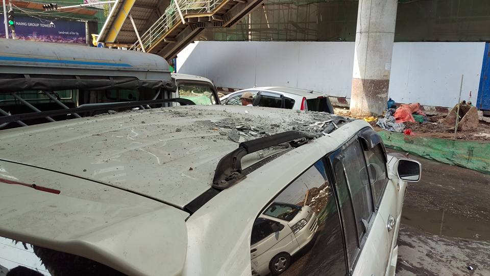 A driver appears to have had a lucky escape on Saturday morning after a concrete slab from the 20-storey Sule Square construction site in downtown Yangon fell and crushed the roof of his car.