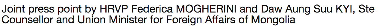 During her visit to Brussels yesterday, Daw Aung San Suu Kyi held a press conference with EU High Representative for Foreign Affairs Federica Mogherini. The two leaders’ statements were predictably platitudinous – Mogherini praised Suu Kyi’s lifelong struggle for democracy, and the Lady told the world not too expect too much from her government.