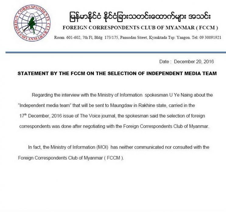 In fact, in an interview last week, Ministry of Information spokesperson Ye Naing told The Voice that the Ministry had consulted with the Foreign Correspondents Club of Myanmar in selecting which foreign journalists to include.