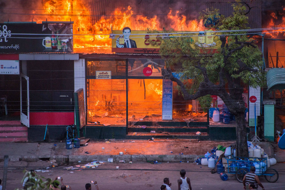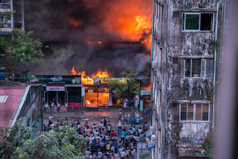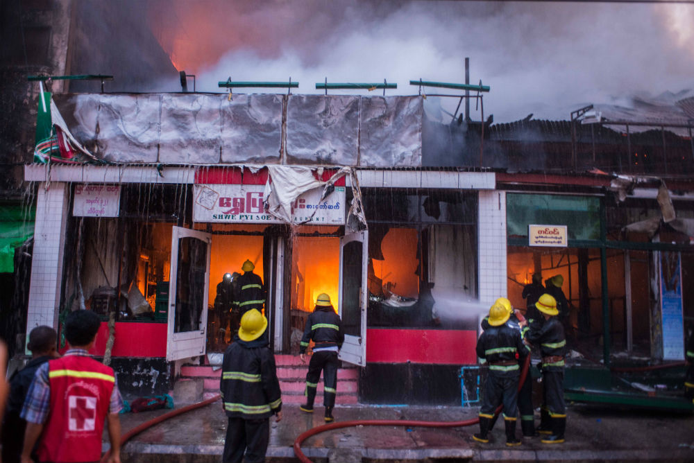 One firefighter was wounded tackling the blaze, according to the Red Cross. Photo: Aung Naing Soe / Coconuts Yangon
