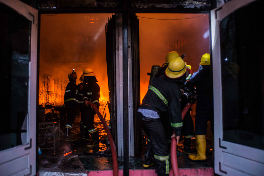 According to the Red Cross, one firefighter was wounded tackling the flames, which spread from Shwe Pyi Soe restaurant in Mingalar Taung Nyunt Township at around 6pm and burned for almost two hours.