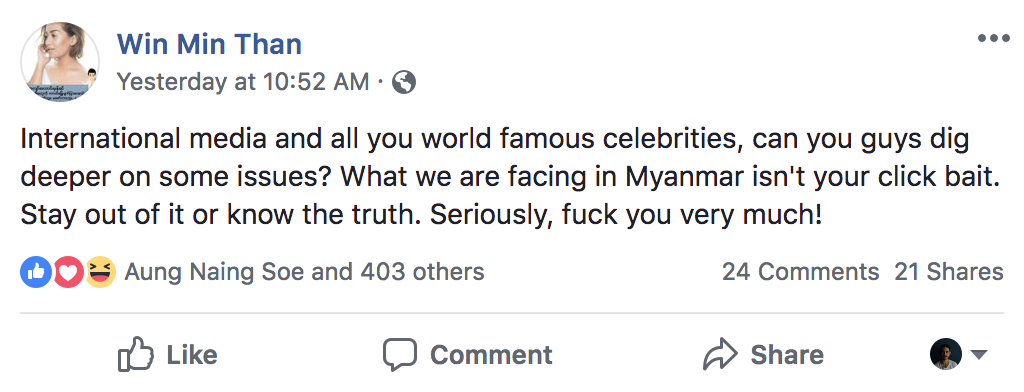 In Myanmar, however, some people don’t think Hadid is spreading love and happiness. One such person is Win Min Than, a Yangon-based entrepreneur and influencer with 145,000 followers on Facebook. In a post yesterday, she accused the model of exploiting Myanmar’s suffering.